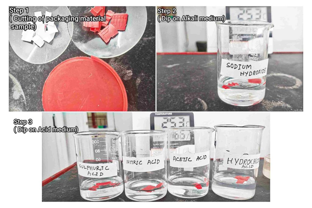Colour Migration or stability test in Acid & Alkali of Food Grade Packaging Material in our Lab