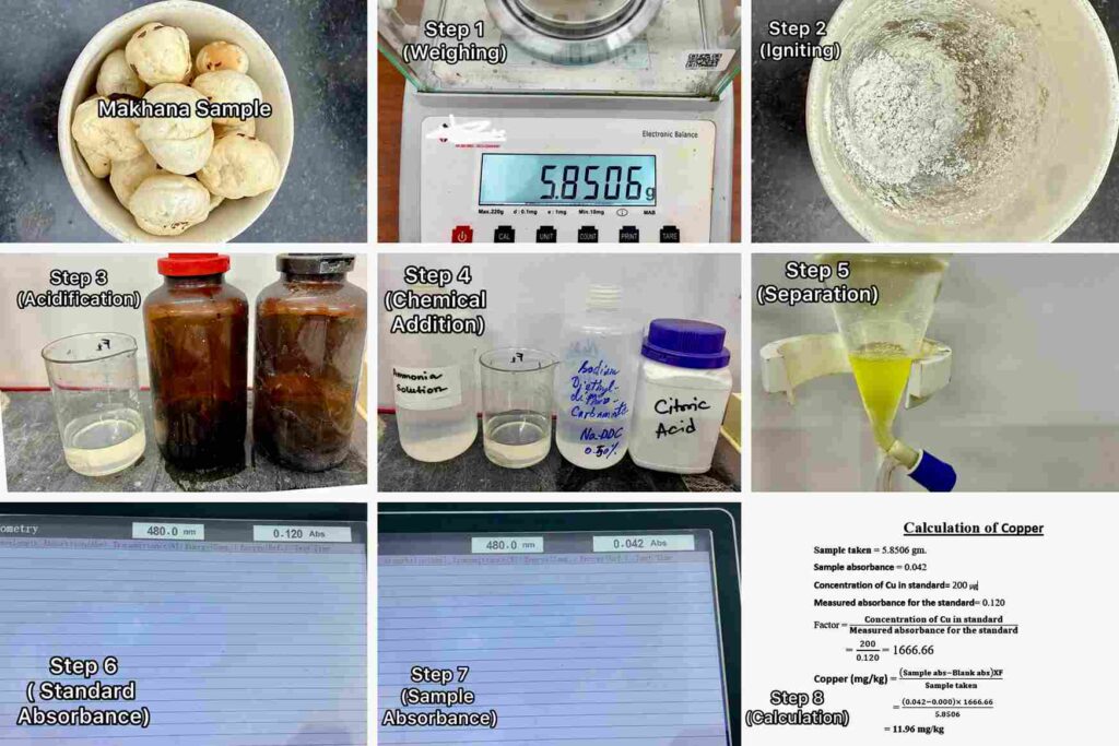 Copper is an essential trace element required for various physiological functions in the human body, but excessive intake can be toxic. Therefore, determining copper content in food is important to ensure nutritional adequacy and safety. The Sodium Diethyldithiocarbamate (NaDDC) spectrophotometric method is a widely used colorimetric technique for the estimation of copper in food samples.
