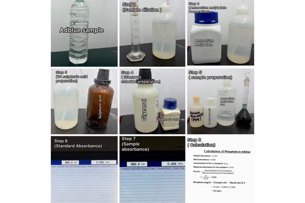 AdBlue (Diesel Exhaust Fluid) helps diesel vehicles run cleaner by converting harmful exhaust gases into harmless nitrogen and water vapor making it essential for modern emission control systems.Phosphate testing in Diesel Exhaust Fluid (DEF) is performed to ensure purity. Excess phosphate can damage the catalyst and reduce emission control efficiency. Phosphate reacts with ammonium molybdate
